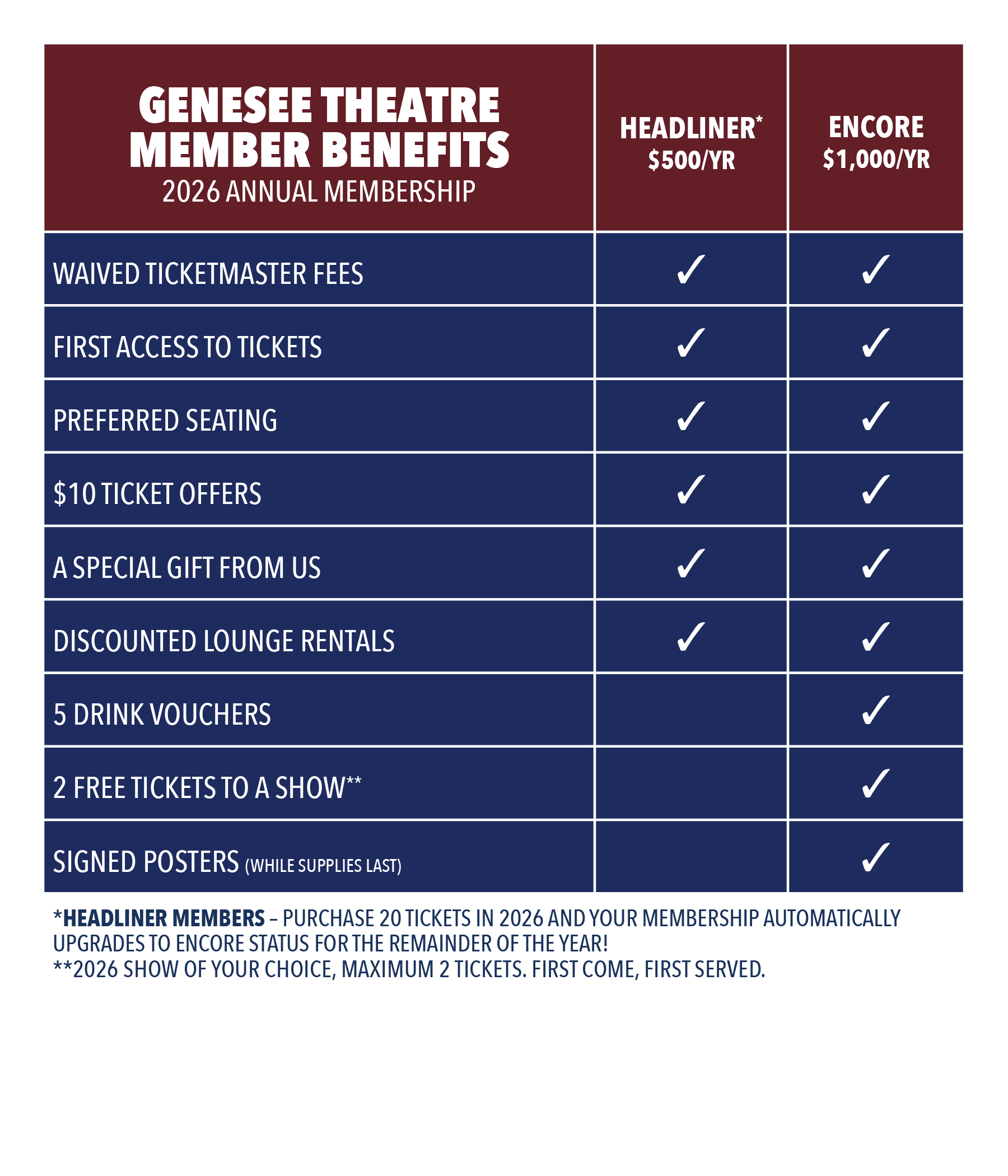 *Headliner Members - purchase 20 tickets in 2026 and your membership automatically upgrades to Encore status for the remainder of the year!